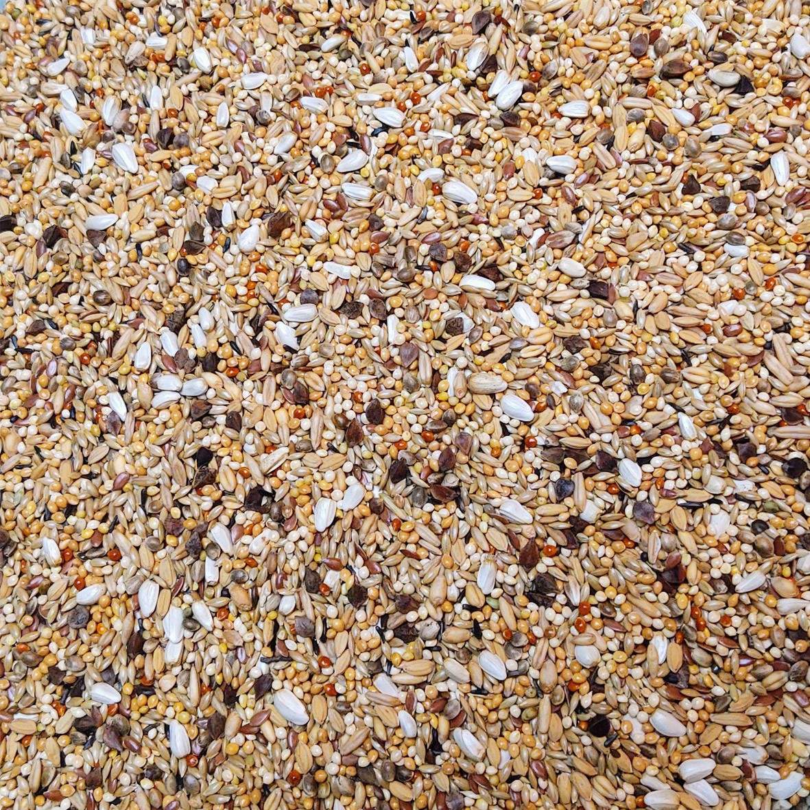 Složení: žluté proso, červené proso, bílé proso, oves, lesknice, kardi, pšenice, neloupaná rýže, pohanka, konopné semínko, lněné semínko, niger,