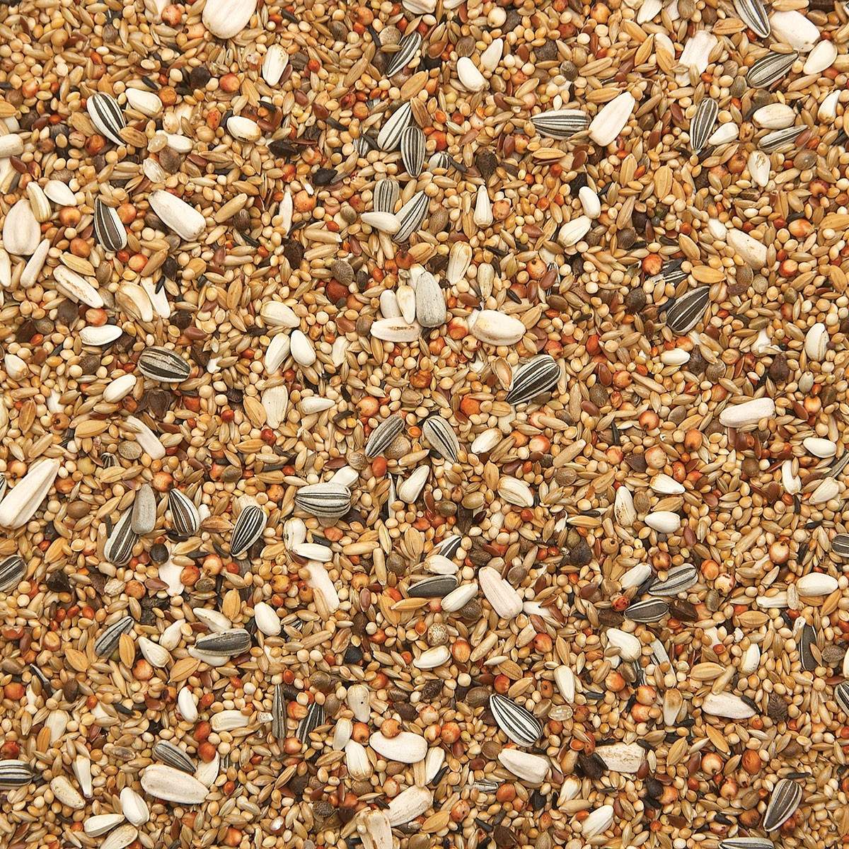 Složení: žluté proso, bílé proso, červené proso, kardi, lesknice, neloupaná rýže, lněné semínko, slunečnice pruhovaná, slunečnice bílá, loupaný oves, pohanka, konopné semínko, niger.
