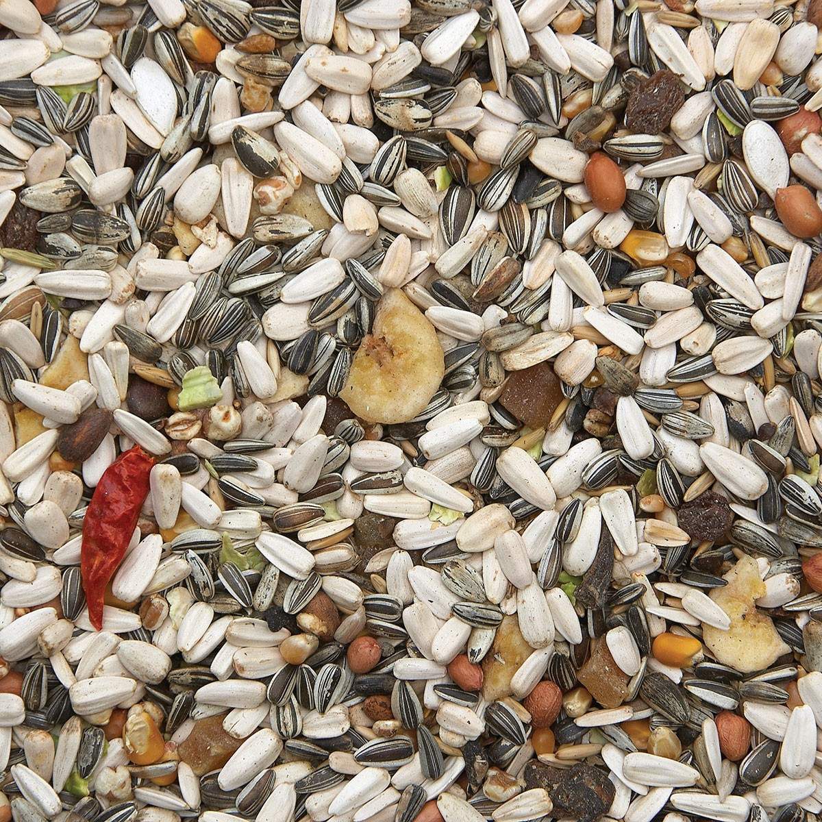 Složení: slunečnice bílá, slunečnice pruhovaná, kukuřice, loupané arašídy, piniové oříšky, oves, pufovaná kukuřice, pufovaná pšenice, hráškové vločky, papája, rozinky, banánové chipsy, dýňová semínka, sušené papriky.